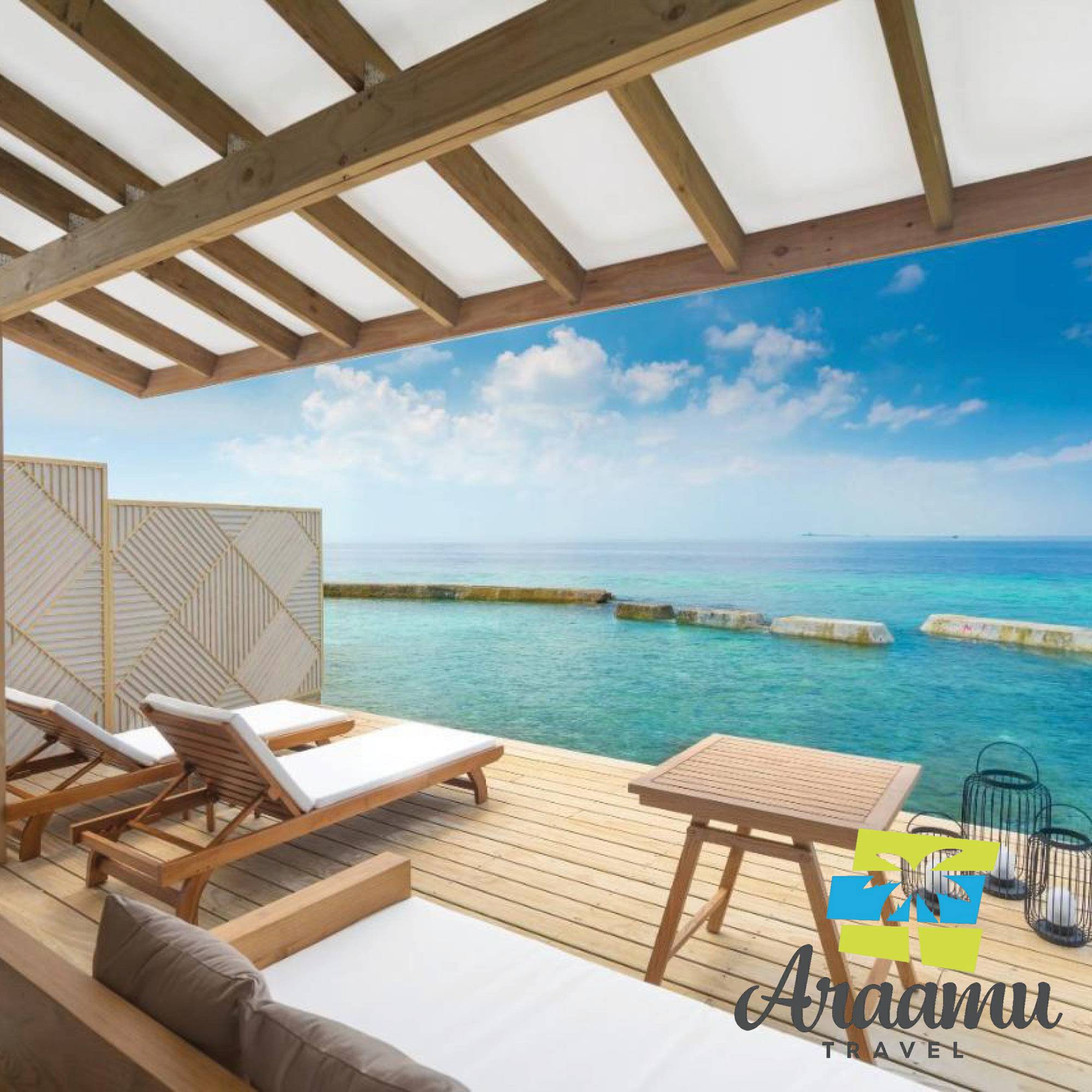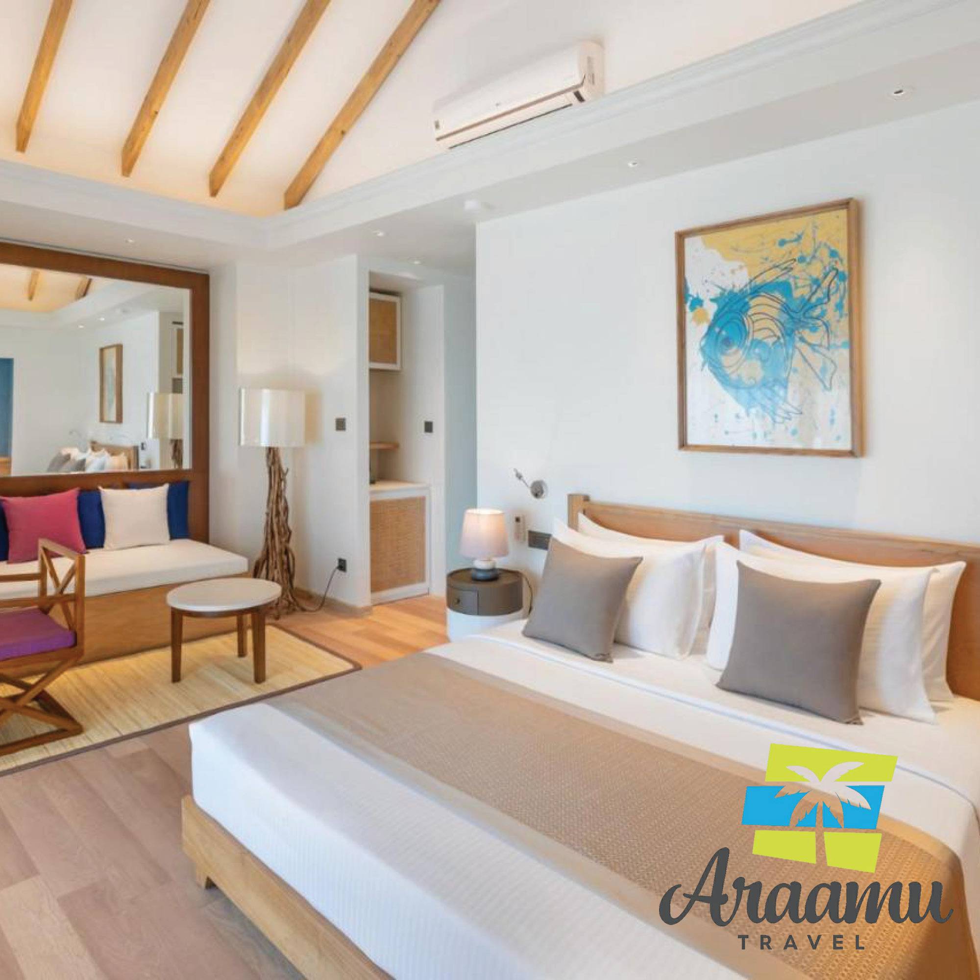 Water Bungalow: kb. 48 nm (28), két lakrésszel, cölöpökre a víz fölé építve, a Beach Bungalow-hoz hasonló, fa padlóval, külön WC-vel, valamint plusz kinti fürdőkáddal és DVD-lejátszóval.
