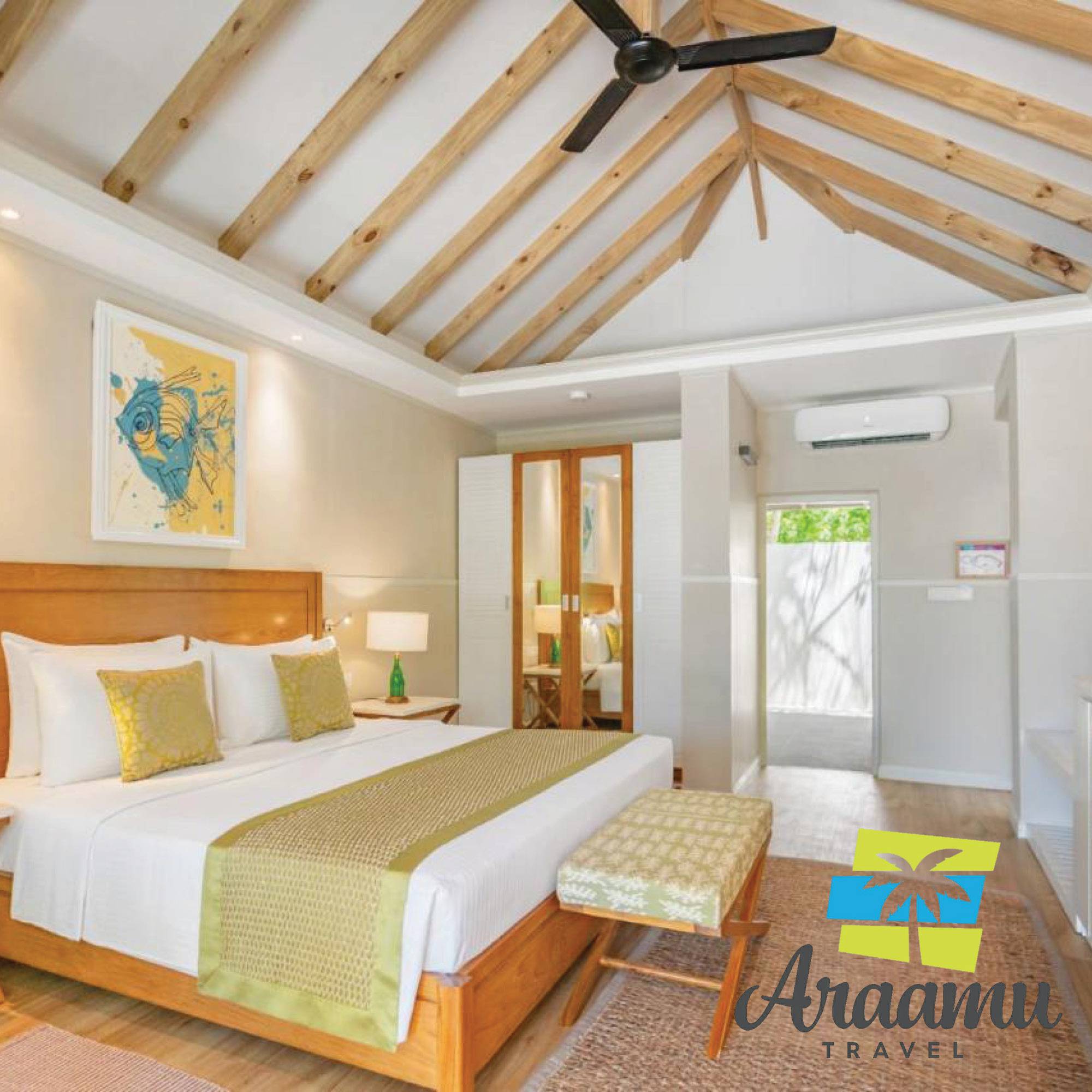 Beach Bungalow: kb. 41 nm (46), különálló bungalók (a következő bungalótól a távolság kb. 2 m), közvetlenül a parton tengerre néző panorámával, a Superior szobák jellemzőivel.