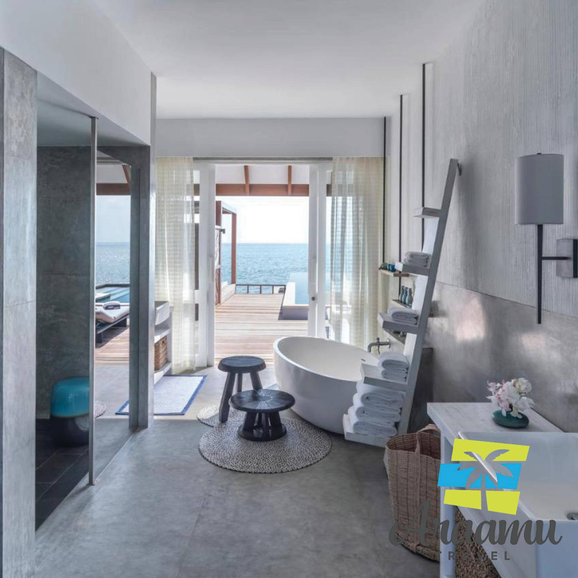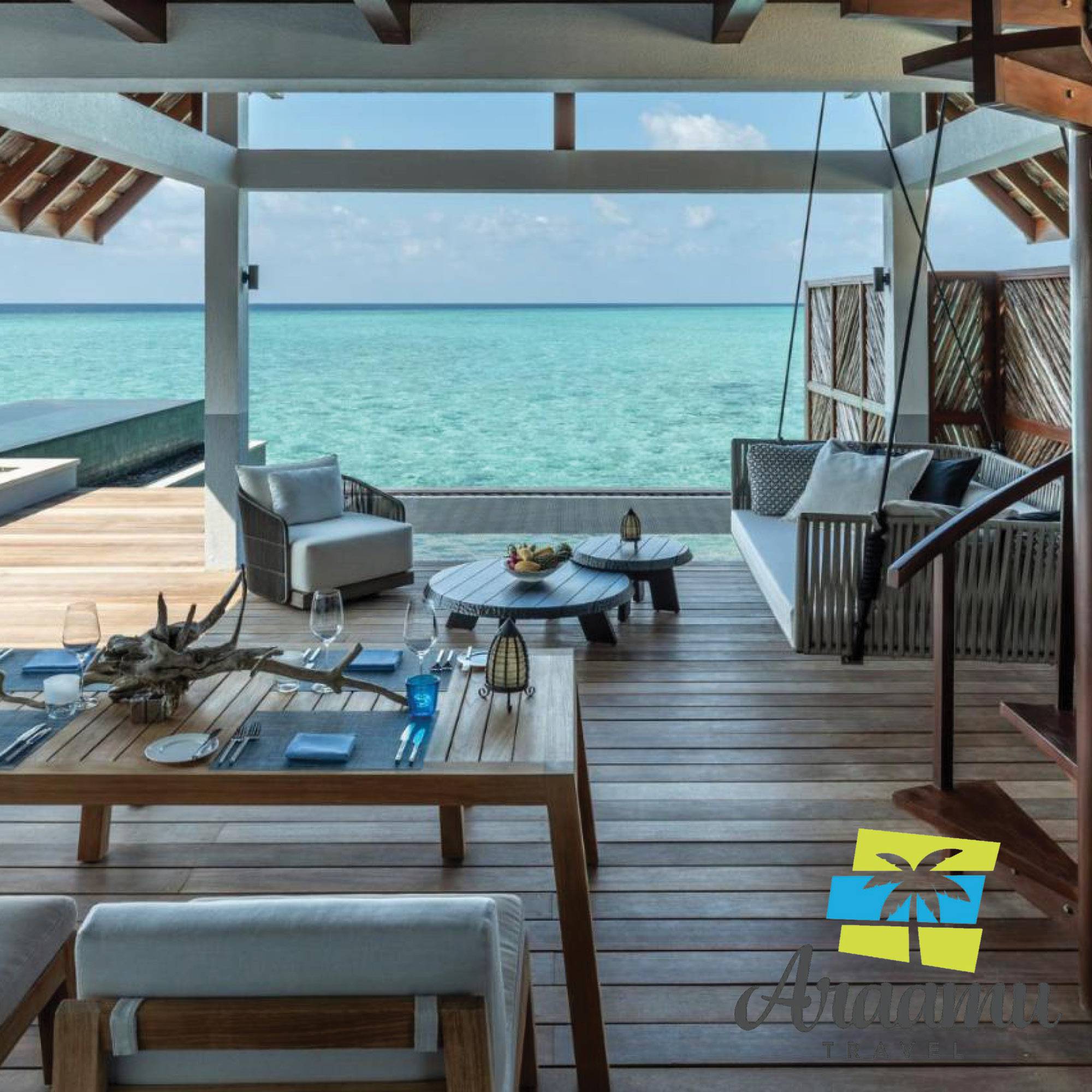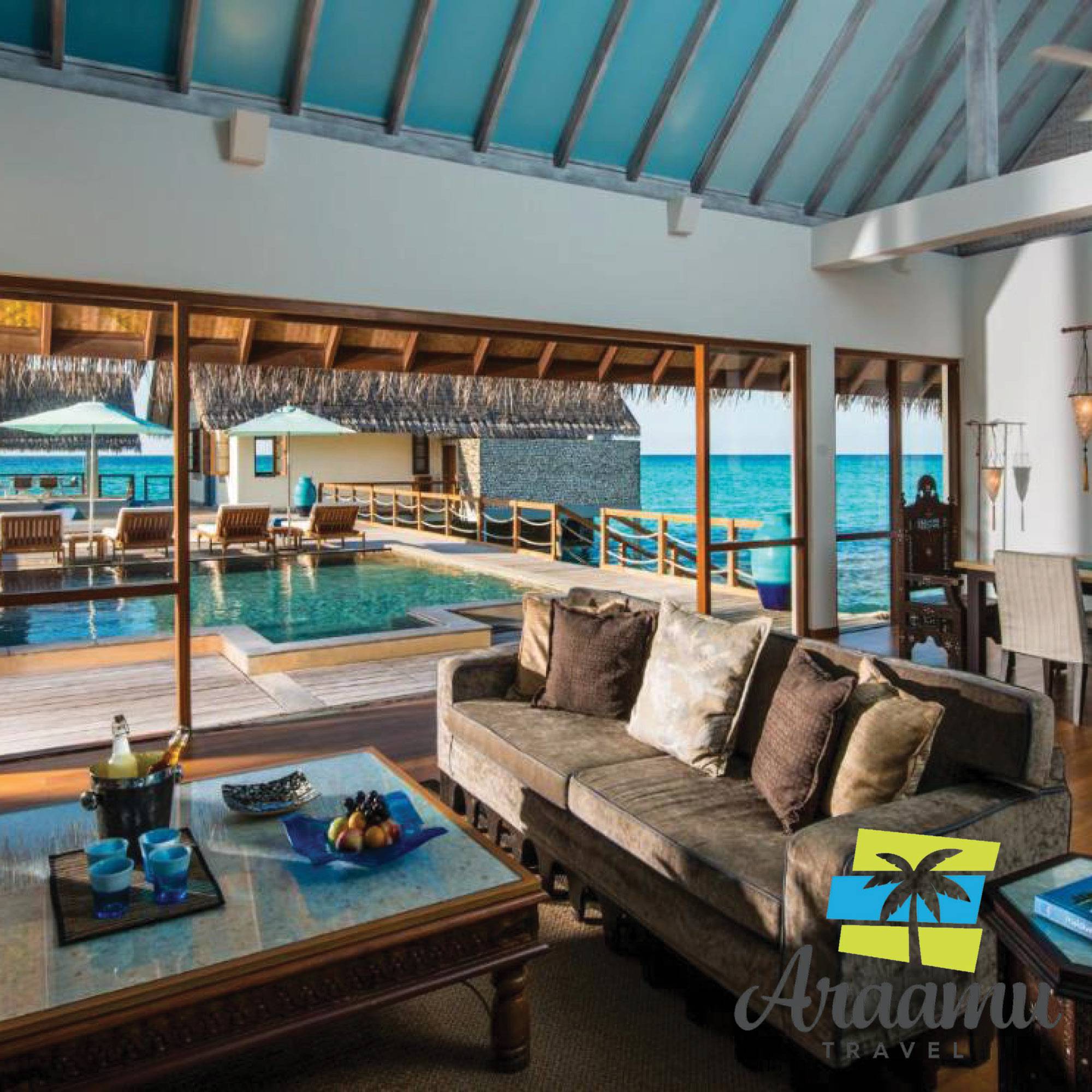 Sunset/Sunrise Water Villa (28) kb. 139 nm (kb. 86 nm lakrész): A türkizkék lagúna felett, az északnyugati csúcson. Külön nappali és háló nagy ablakrészzel, panoámaterasz (53 nm) nyugágyakkal, közvetlen lejárat az óceánhoz. Választhatóan napkelte vagy napnyugta irányában.