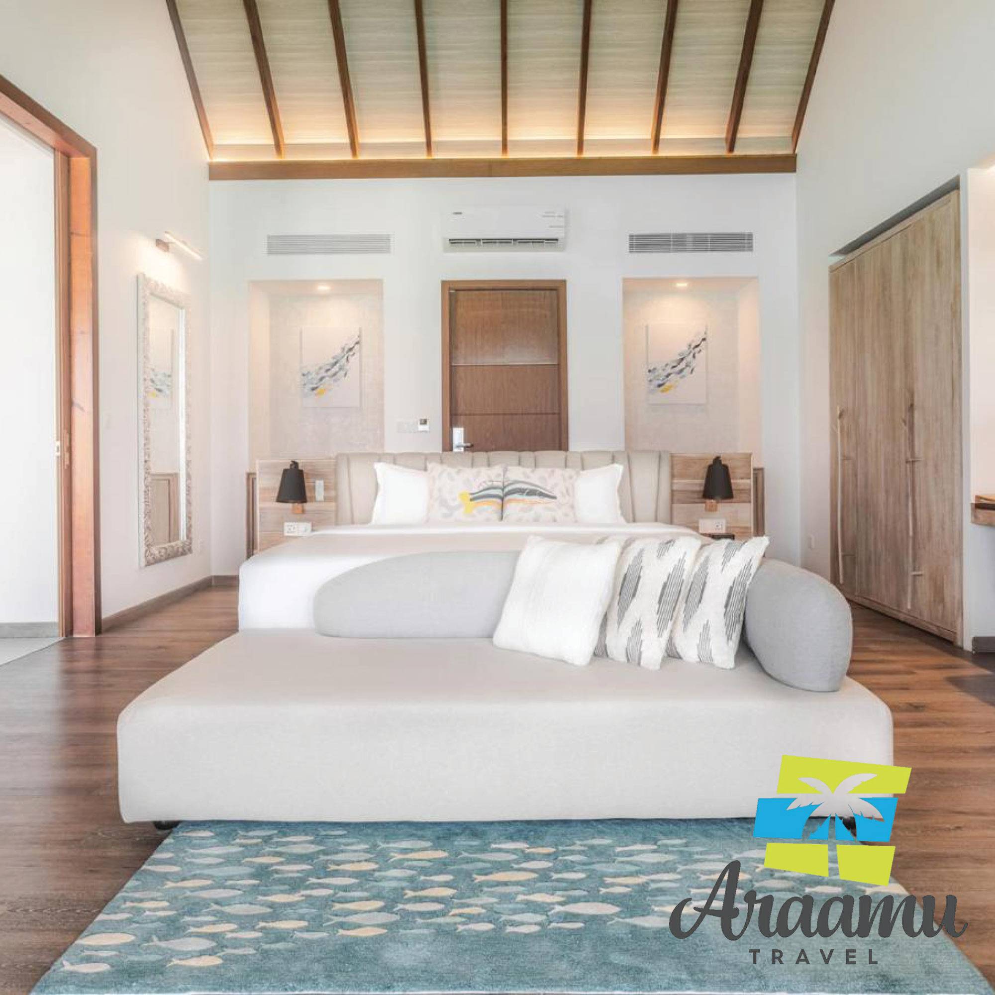 Water Villa: kb. 95 nm, nyitott fürdőszoba fürdőkáddal és tusolóval, vasaló és vasalódeszka, mennyezeti ventilátor, hajszárító, kávé- és teafőző, íróasztal, telefon, terasz, minibár (térítés ellenében), klíma.