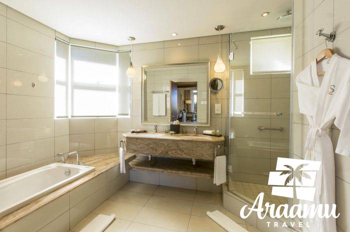 Beach Front Suite: tengerre néző, kb. 52 m², utólagos felújítás 2014, légkondicionáló, széf, mennyezeti ventilátor, kanapé, kávé-/teafőző, minibár (térítés ellenében, naponta töltik), telefon, WiFi (ingyenes), TV, hálószobában, TV, zuhany, fürdő, WC, fürdőköpeny, papucs, hajszárító, terasz.